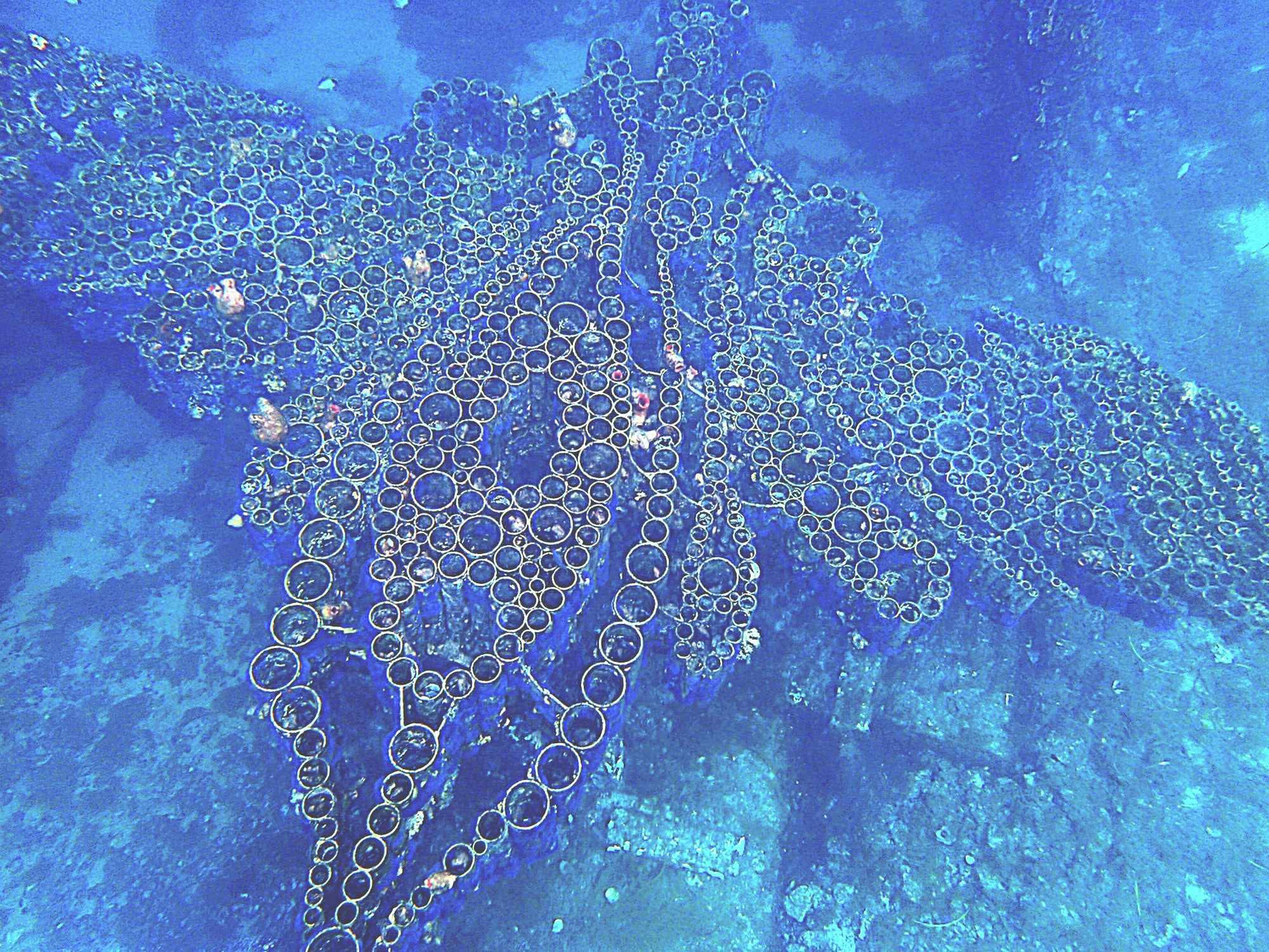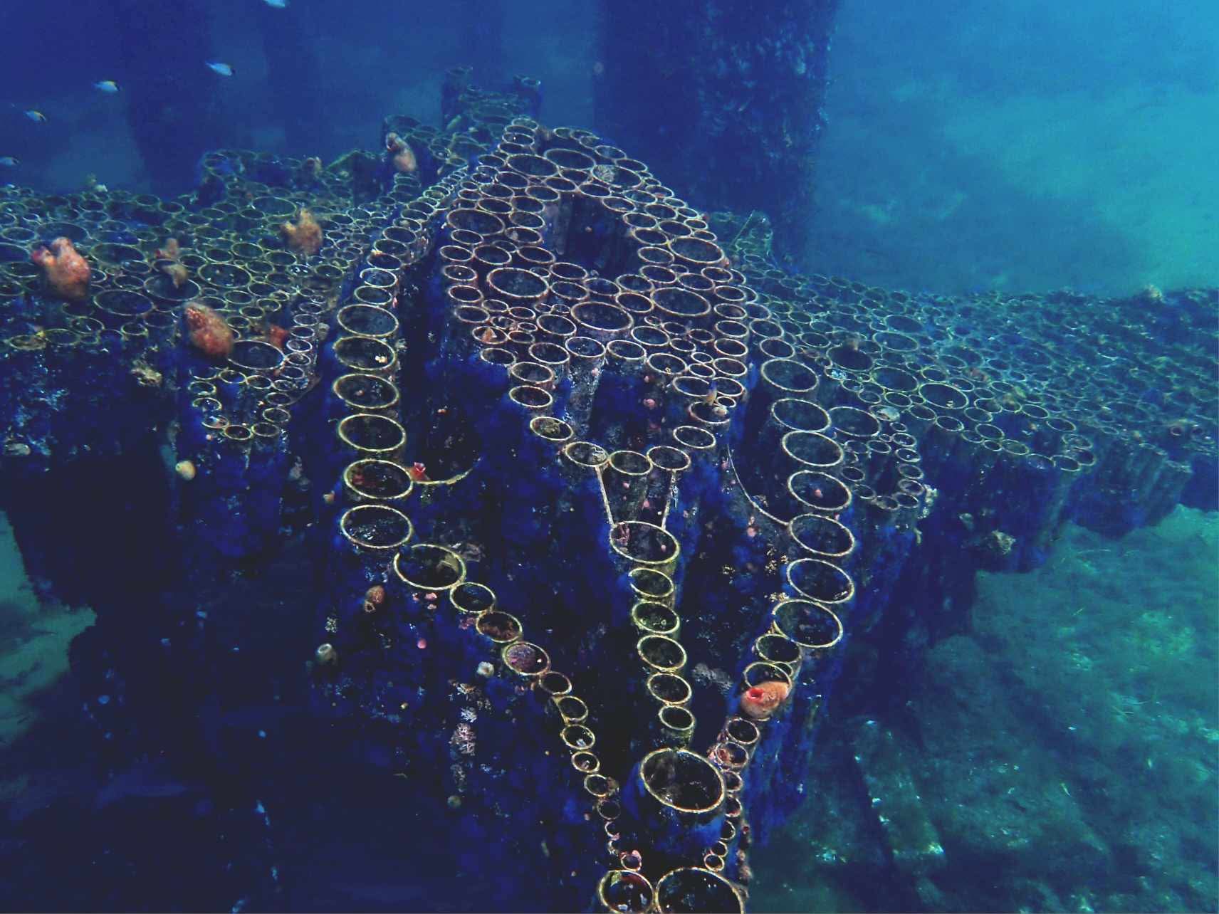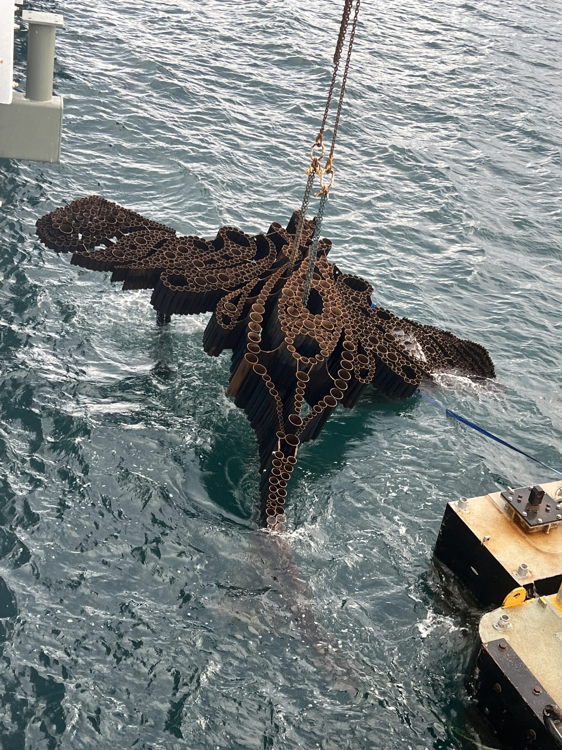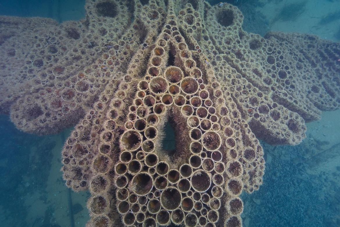 Fabricated from over 1500 steel pipes of various dimensions, ranging from 27mm to 140mm in diameter and cut between 100mm to 600mm in height, it creates perfect hidey holes for marine species, coral, and sponges. By encouraging coral propagation within the pipework and crevices, Stella becomes a thriving artificial reef, enhancing biodiversity, promoting marine life growth and supporting ocean health.