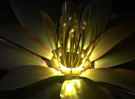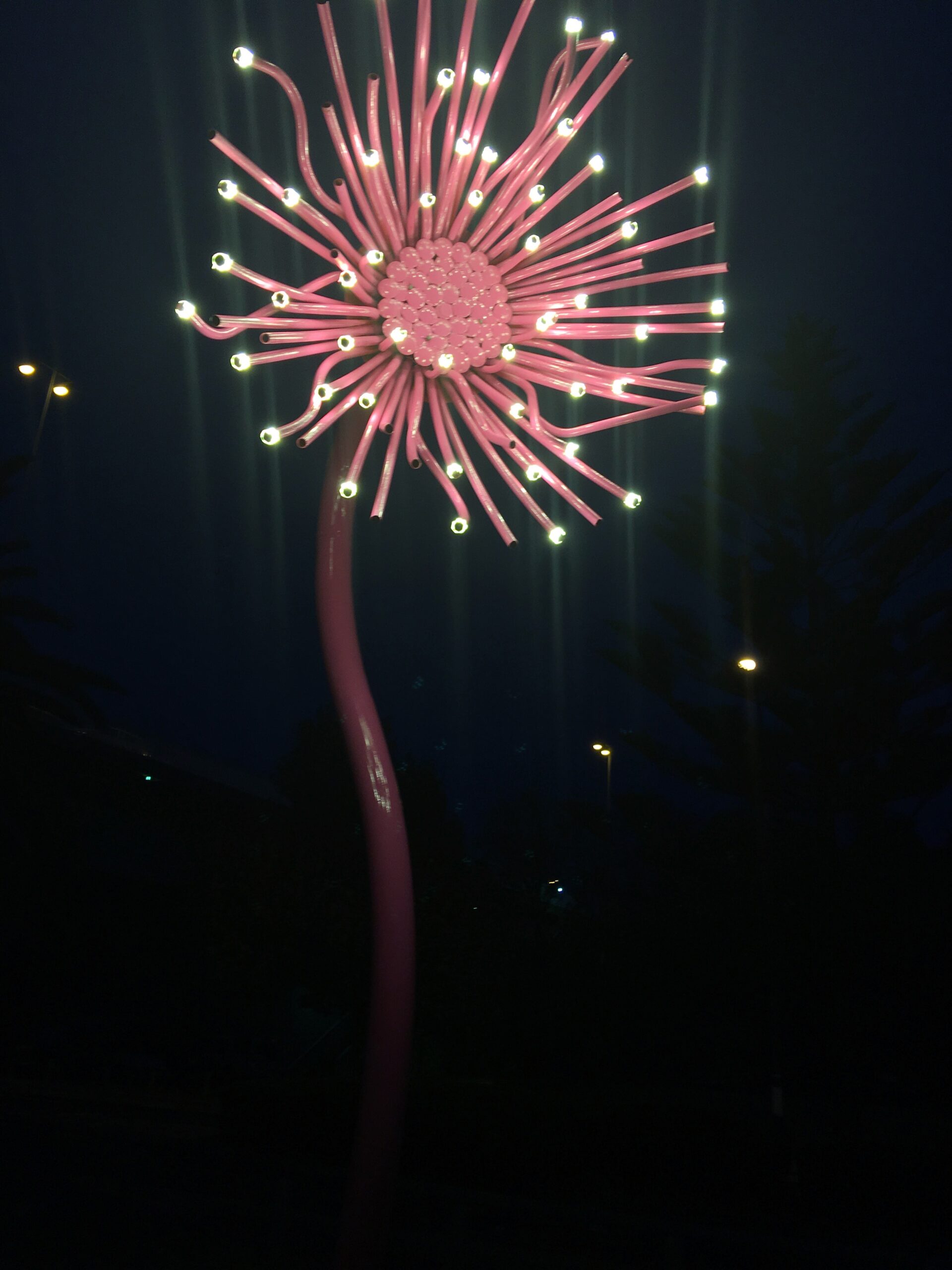 Soft pinks and purples reflect the feminine spirit, with two custom shades I created and named after my children: the deeper pink is Kai’s Kiss (for my daughter), and the lighter pink is Nixxy Noxxy (for my son). The petals are inset with magenta perspex to catch the sunlight, adding a luminous glow by day, while LED lights bring them to life at night.
