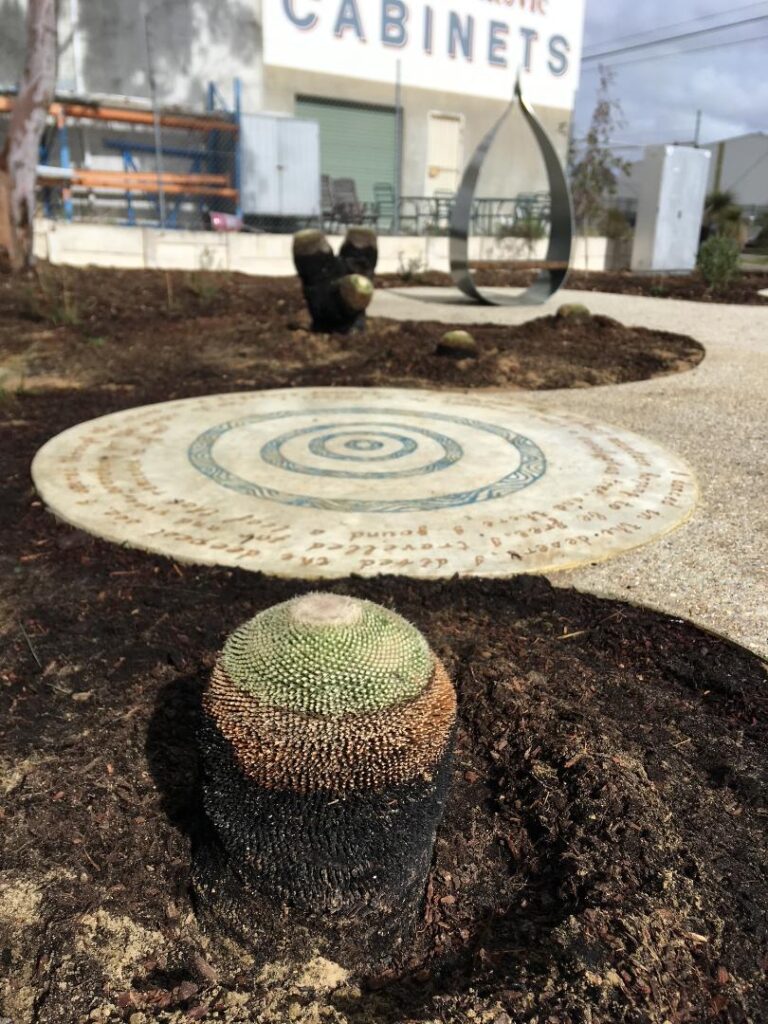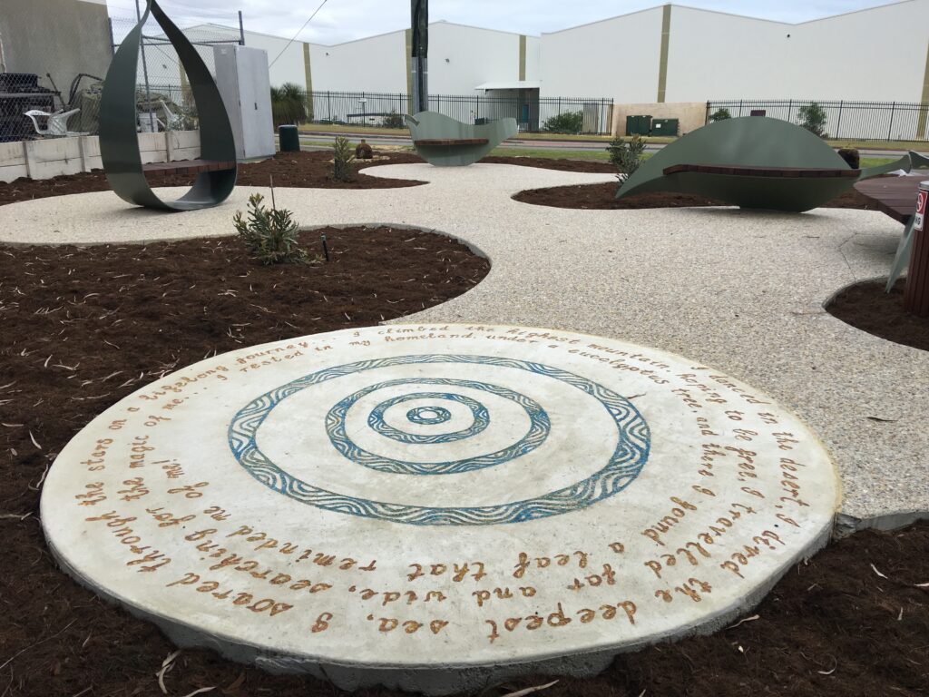 The poem surrounds a ground artwork by the talented Sharyn Egan, which represents the five lakes of the area and reflects the importance of water to the local Indigenous community. The inlay was painted and installed under the guidance of the wonderful Scape-ism team — with special thanks to Jahne and Liam for their care. Gratitude also to the skilled crew at Wenco, whose expertise in industrial steel rolling helped me bring the complex leaf forms to life.